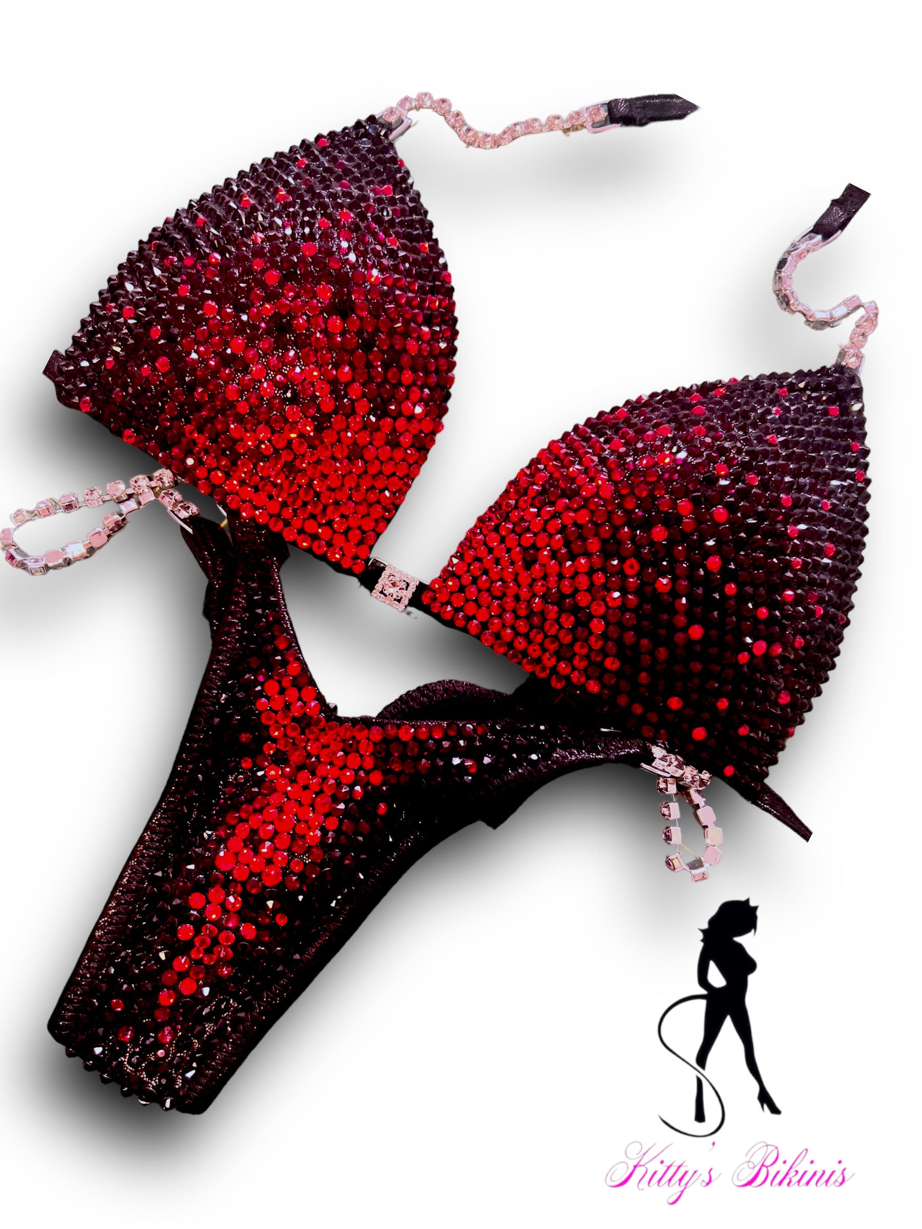 Make a bold statement on stage with our stunning custom bikini, featuring a captivating red and black fade design. Adorned with high-quality crystals in Siam, Dark Siam, and Jet Black, this suit sparkles brilliantly under the lights, ensuring all eyes are on you.