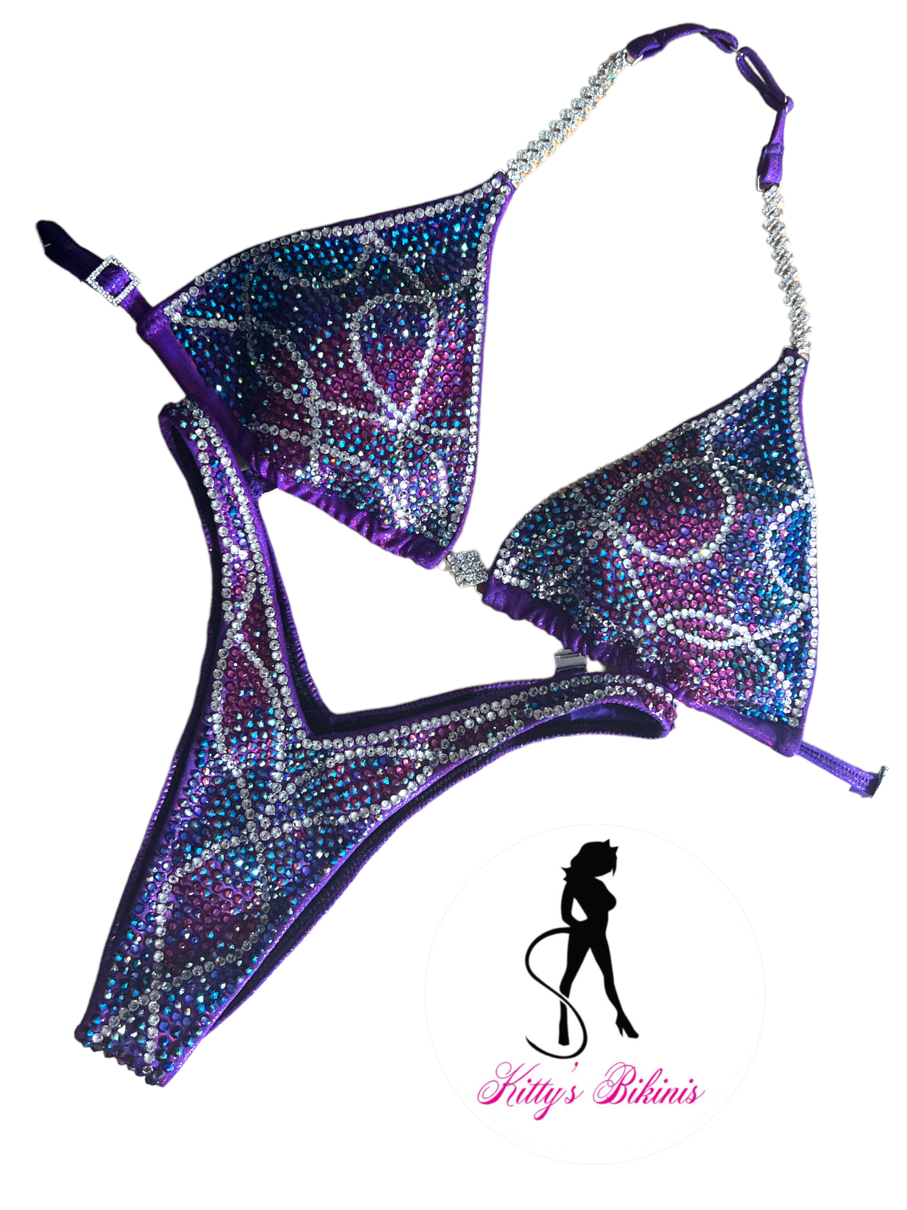 Designed with a classic triangle top, this bikini features a stunning combination of Helio, Troop, Fuchsia, Fuchsia Shimmer, and Amethyst AB crystals, fully hand-embellished front and back to shimmer under any stage light.