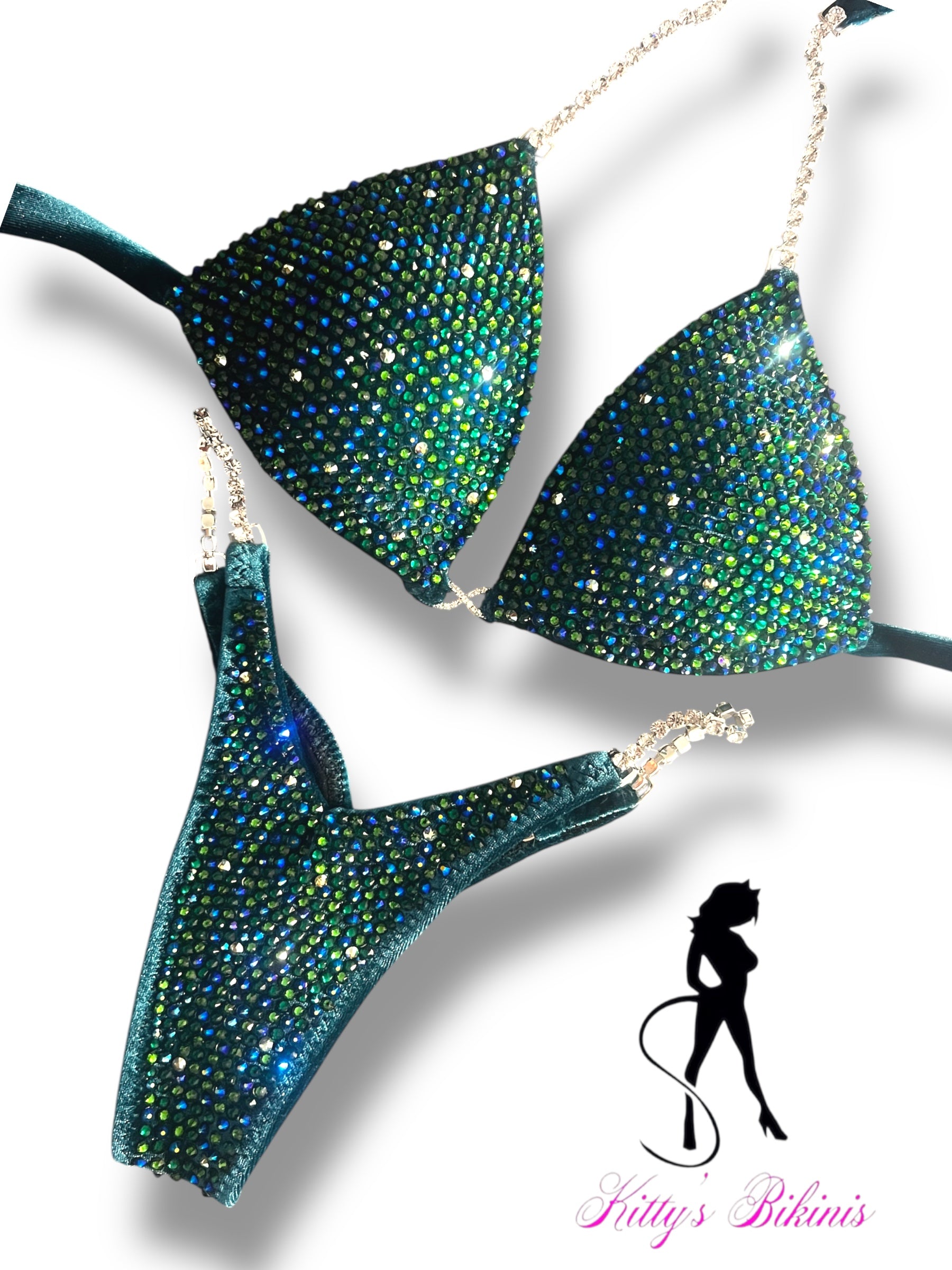 Covered in premium emerald fern, green, and emerald AB crystals with scattered paradise AB accents, this suit shimmers beautifully under the lights.