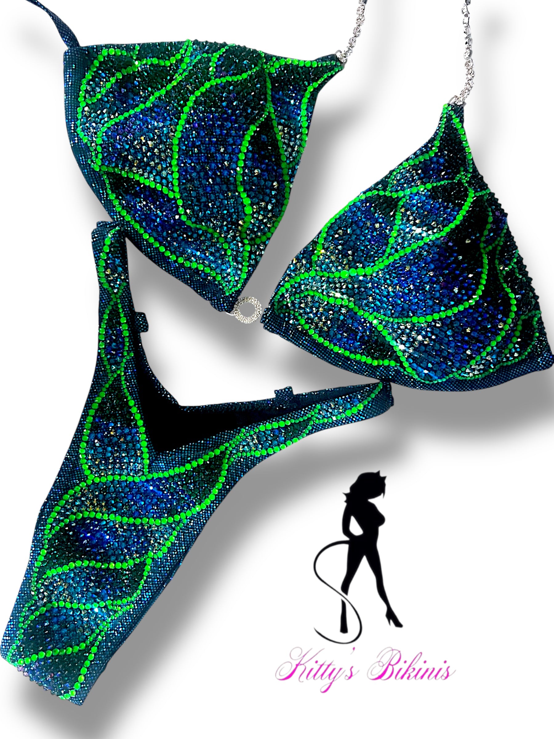 Make a bold statement with the Neon Wave Green Figure Suit. This stunning suit includes a supportive top designed for DD cup sizes and features a vibrant neon green color that truly stands out. The adjustable hip connectors on the bottoms ensure a comfortable fit, accommodating hip sizes ranging from 34 to 38 inches. With its dynamic wave design fully embellished with high-end crystals on both the front and back, this suit is perfect for competitions or performances, allowing you to shine with confidence and style!