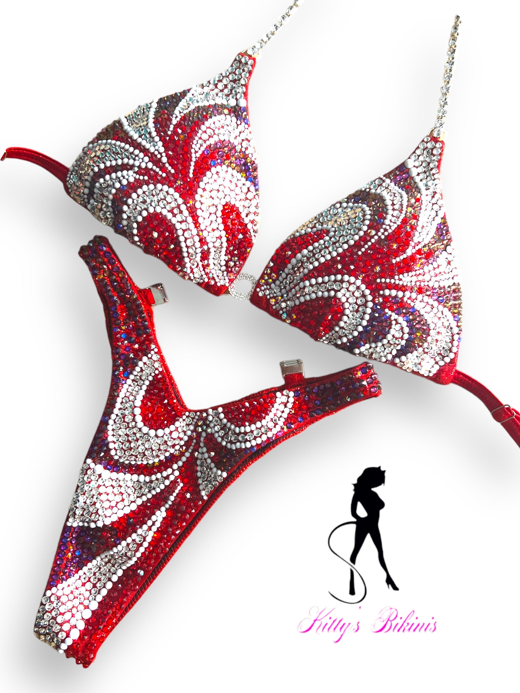 Bring the heat with a twist in our Peppermint Blaze figure suit — a fierce and flirty design that’s impossible to ignore. This fully crystallized showstopper features a bold swirl pattern made from Siam red fading into Volcano purple, accented with brilliant white crystals to create a vivid, candy-cane-inspired effect with a fiery edge.